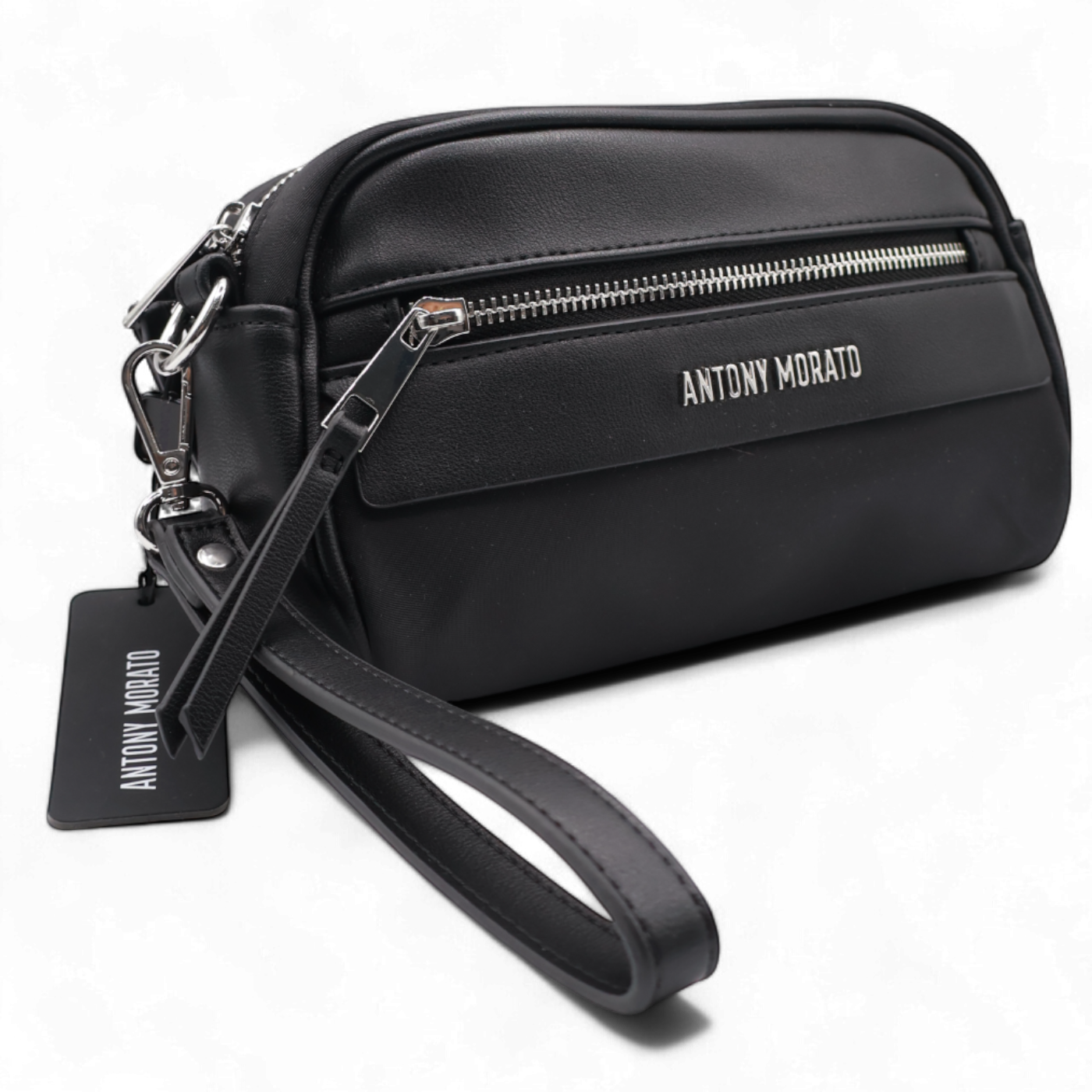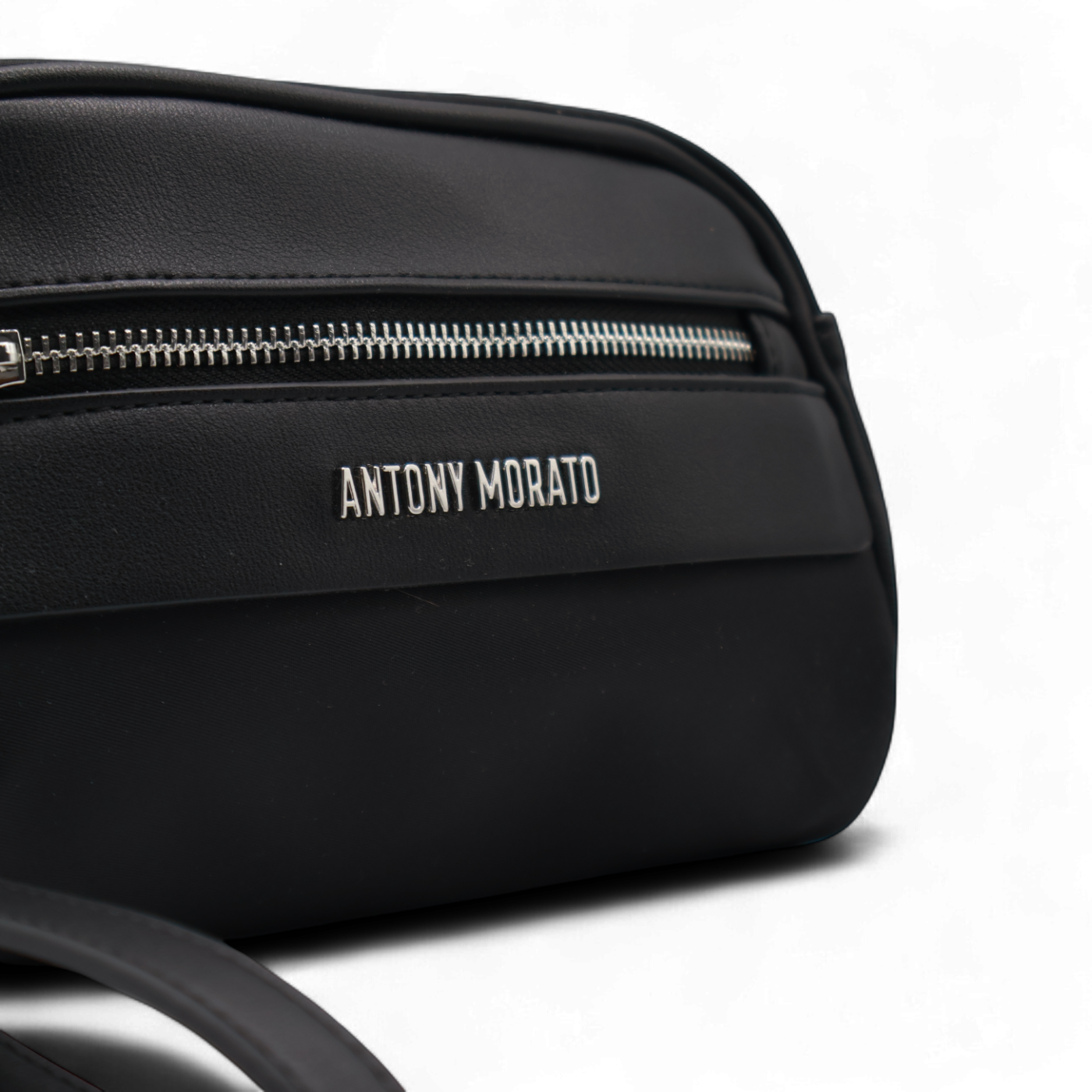 Bandolera Antony Morato negra con logo efecto 3D. Estilo urbano y funcional, ideal para llevar tus objetos personales con comodidad y estilo.