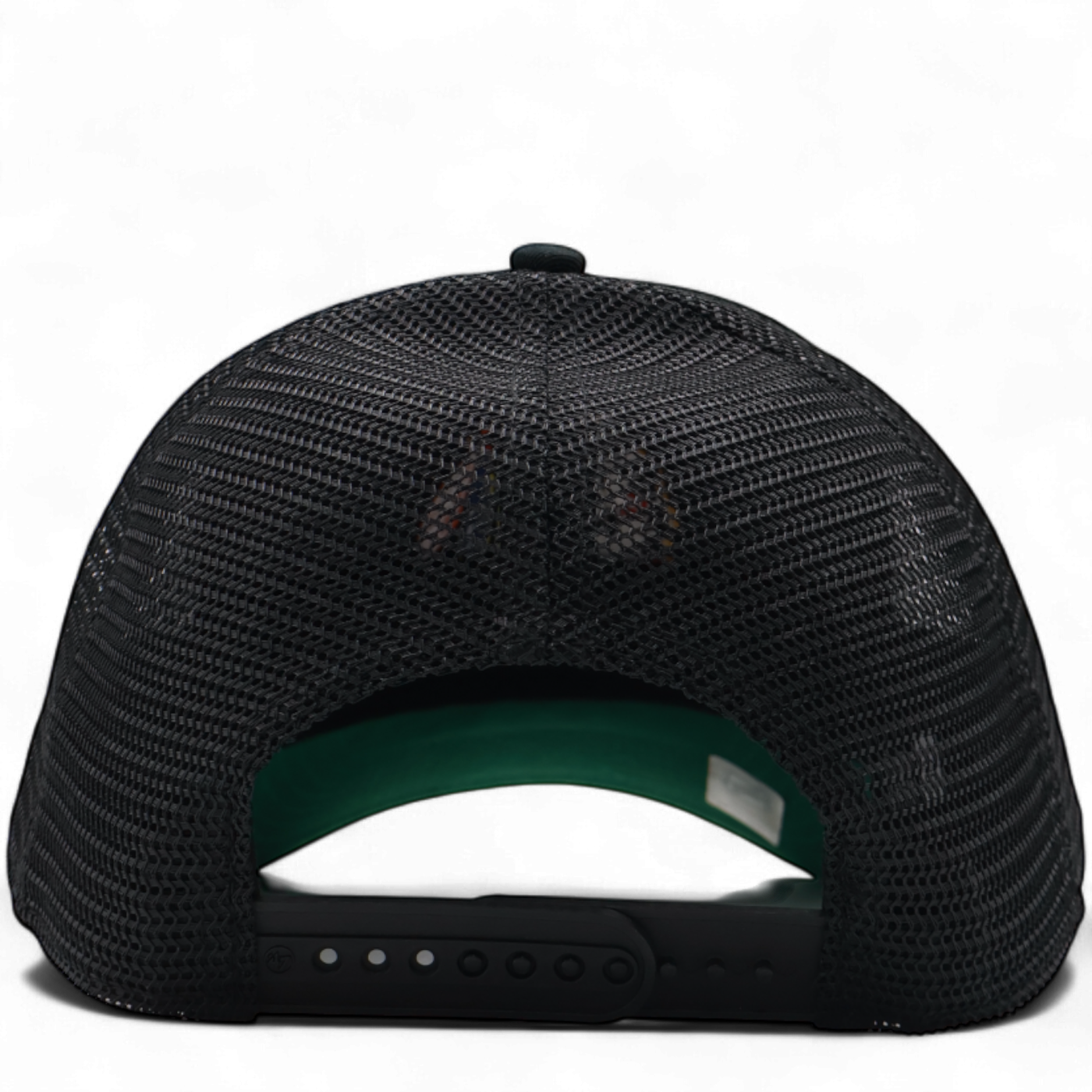 Gorra Goorin Bros Búfalo Ruthless Two-Tone Verde y Gris estilo trucker, con parche bordado y cierre ajustable.