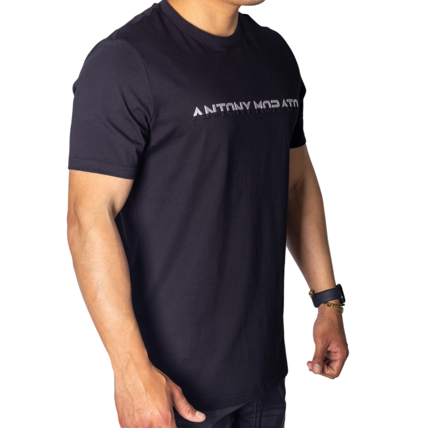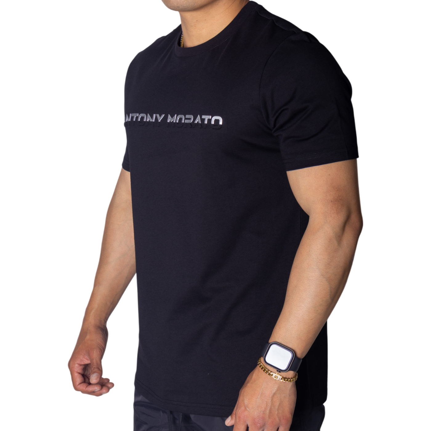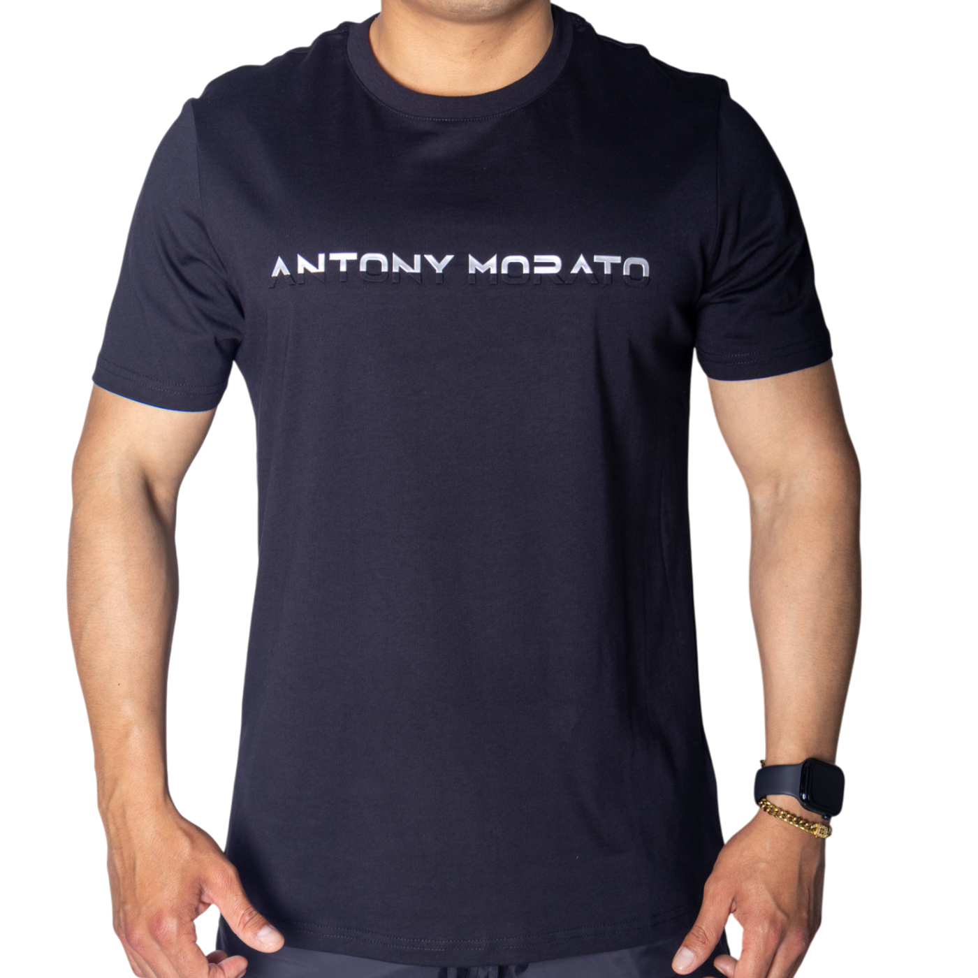 La Camiseta Antony Morato de Algodón Negro con Estampado Laminado Plata combina estilo, comodidad y un toque de distinción.