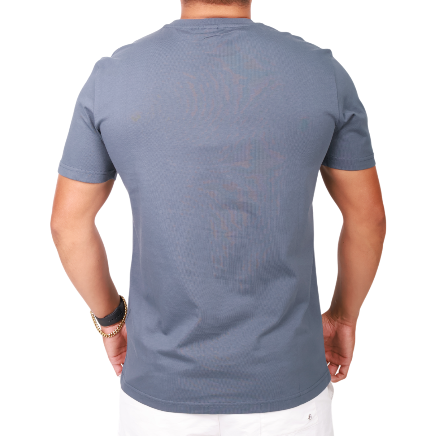 Camiseta Antony Morato azul sky de algodón con estampado laminado en plata. Moderna, cómoda y perfecta para un look urbano y sofisticado.