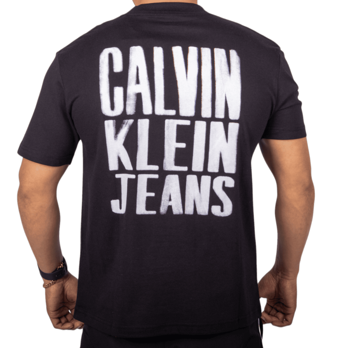 Camiseta Calvin Klein negra con bloque gráfico. Algodón premium, diseño moderno y cómodo, ideal para un estilo urbano y casual.