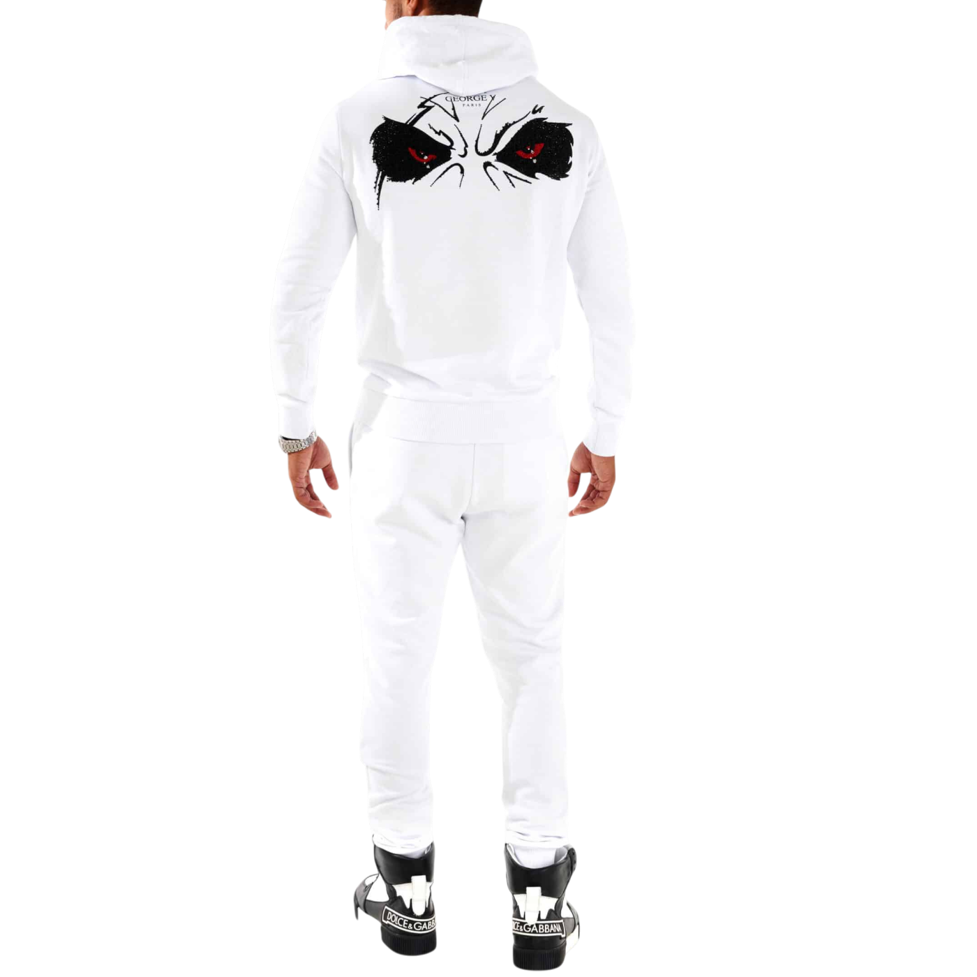 El Chándal Completo George V Paris Devil Oso Blanco representa la esencia del streetwear de lujo. Confeccionado con tejidos de alta calidad, ofrece una sensación suave, ajuste cómodo y una durabilidad excepcional. Su diseño destaca por el distintivo estampado del “Devil Oso”, símbolo de fuerza y exclusividad, sobre un elegante fondo blanco que resalta cada detalle.