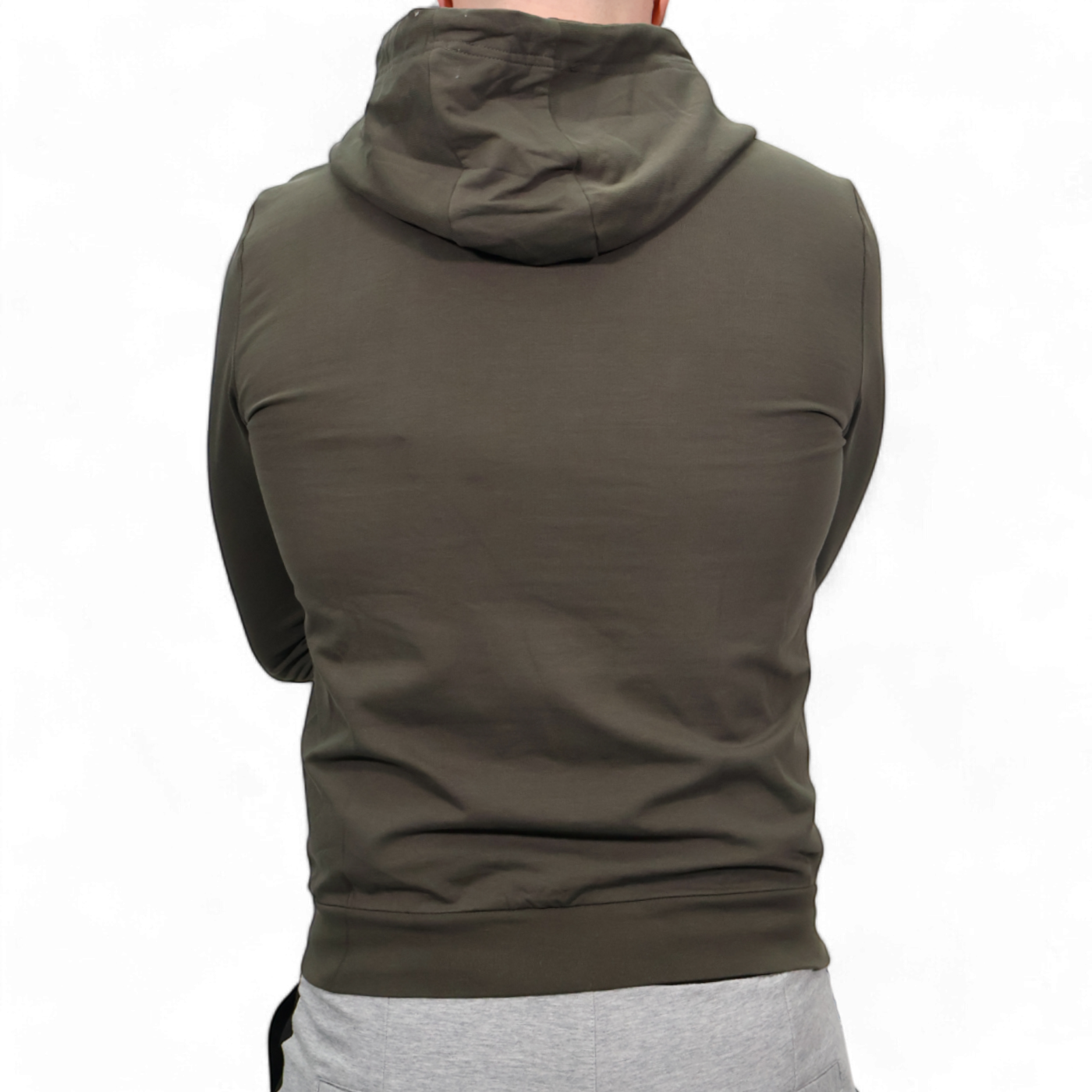 Sudadera con capucha Calvin Klein verde con placa en brazo. Diseño urbano, algodón premium y logo distintivo para estilo moderno y cómodo.